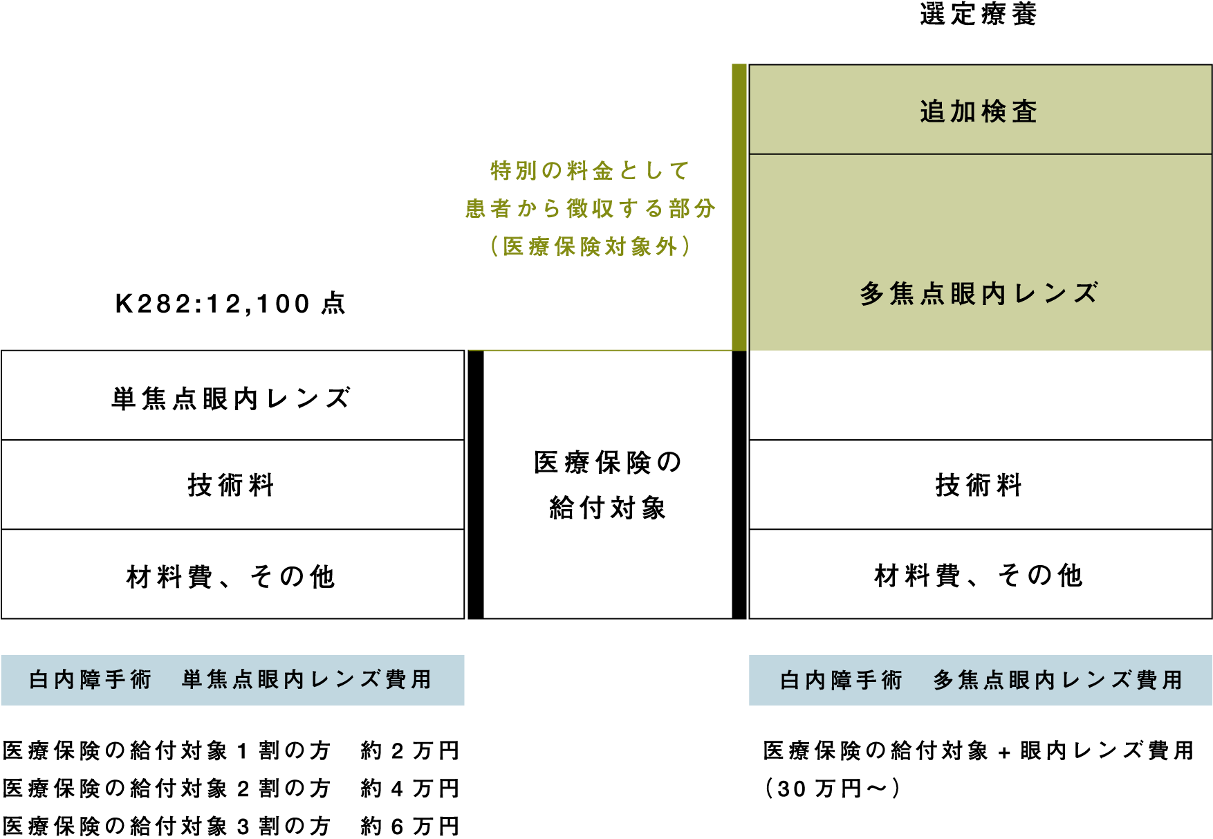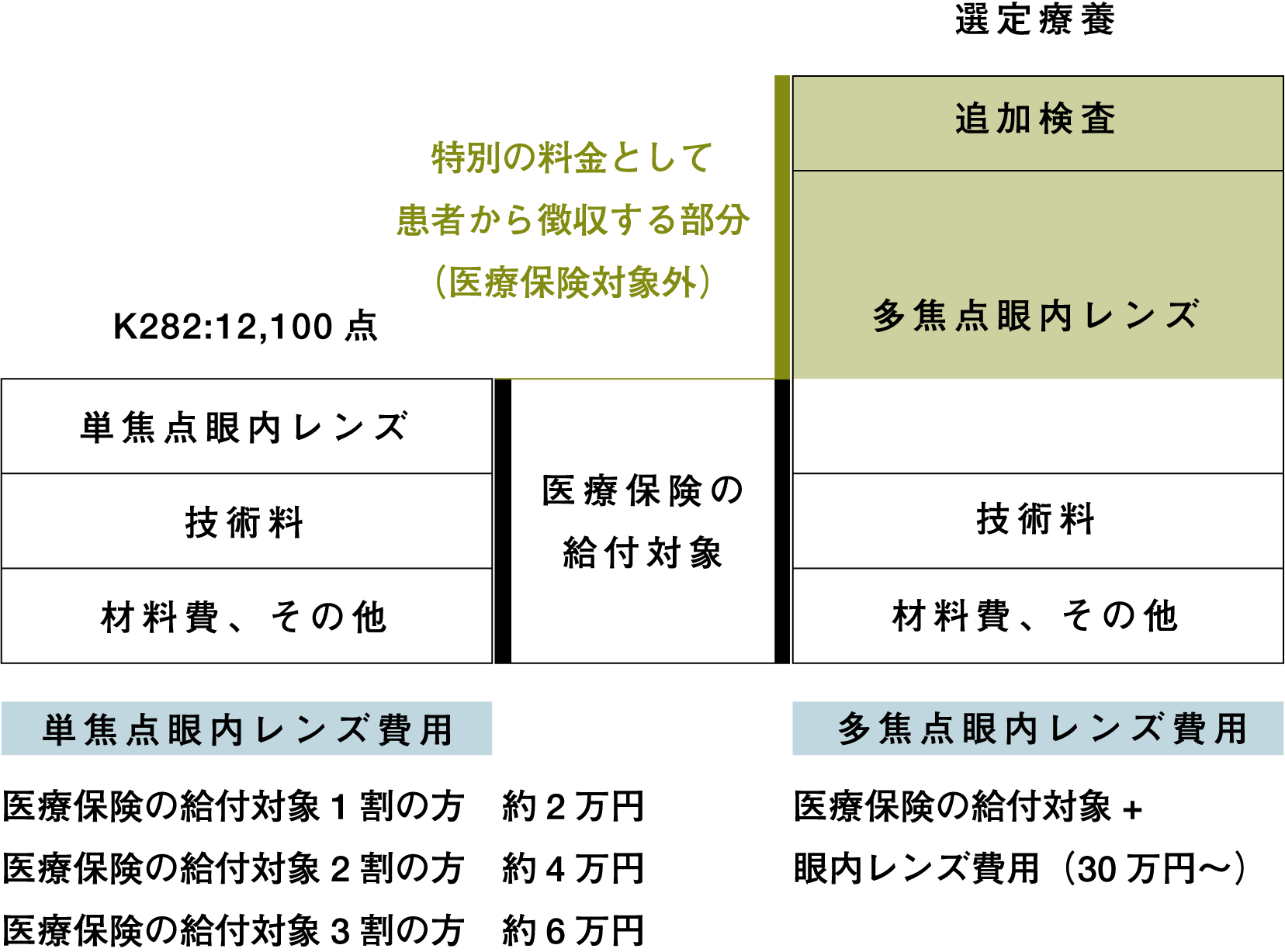 費用は選定療養の部分は医療保険が適用されず、全額自己負担となり、使用するレンズの種類により異なります。