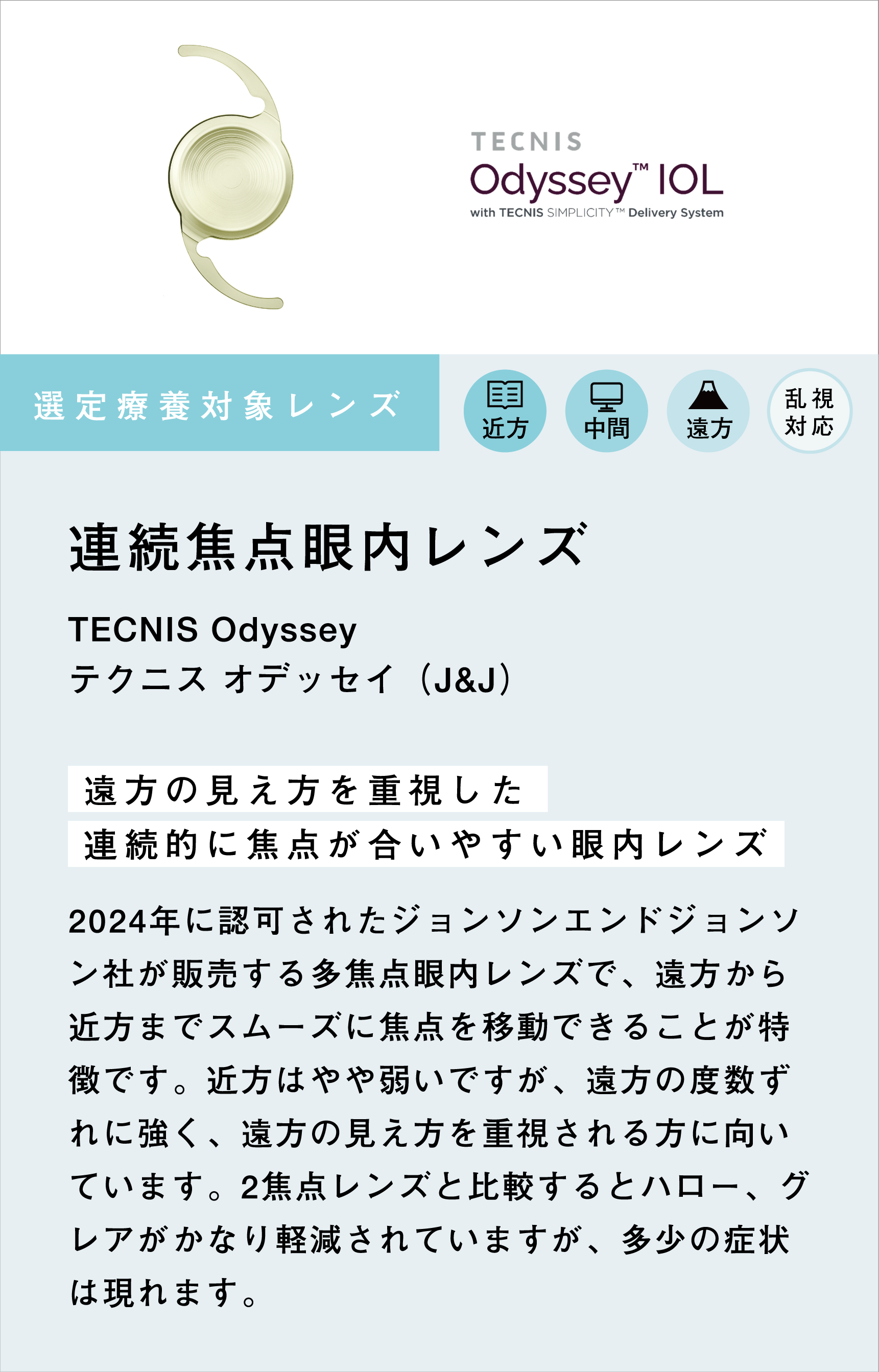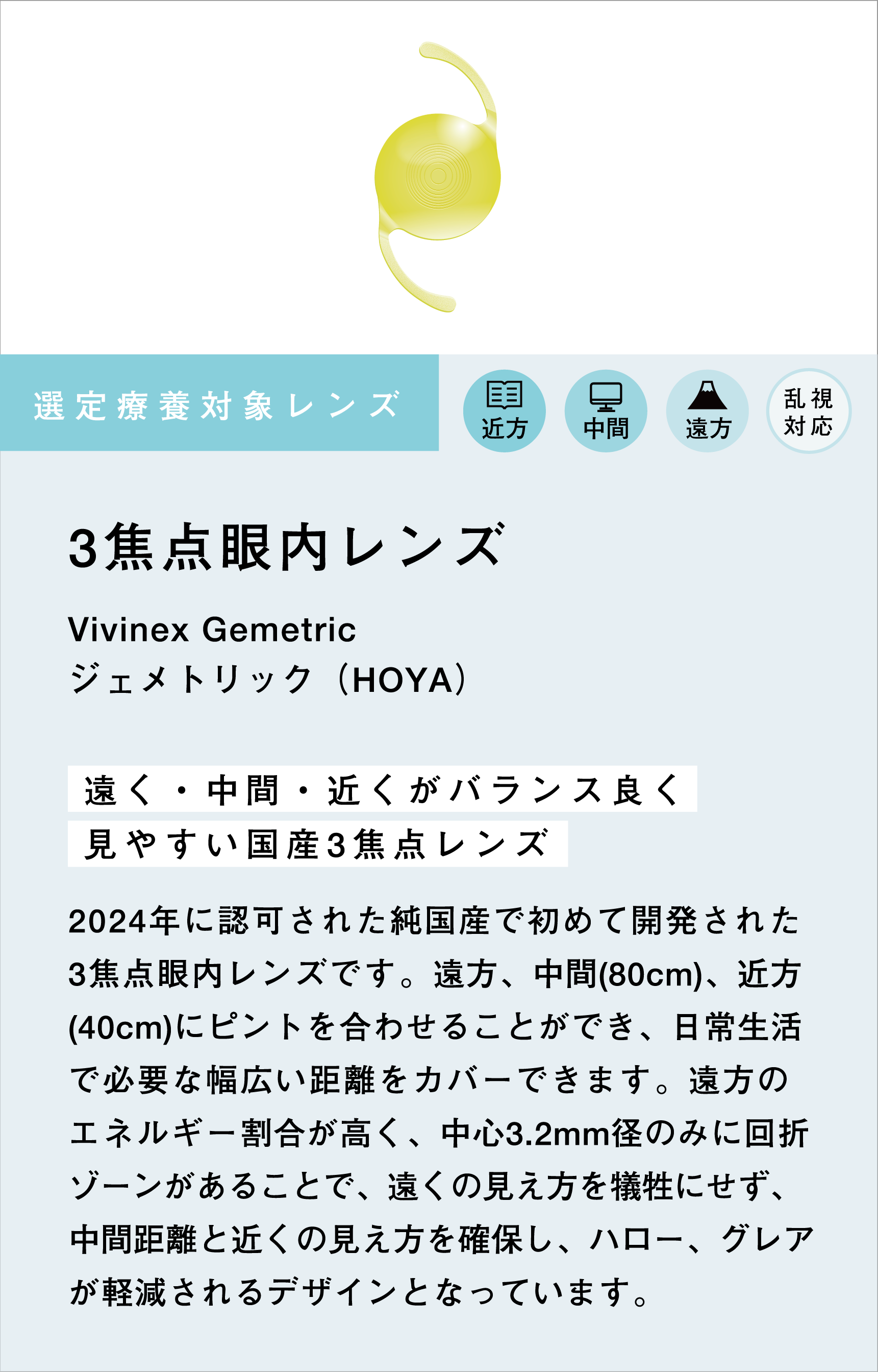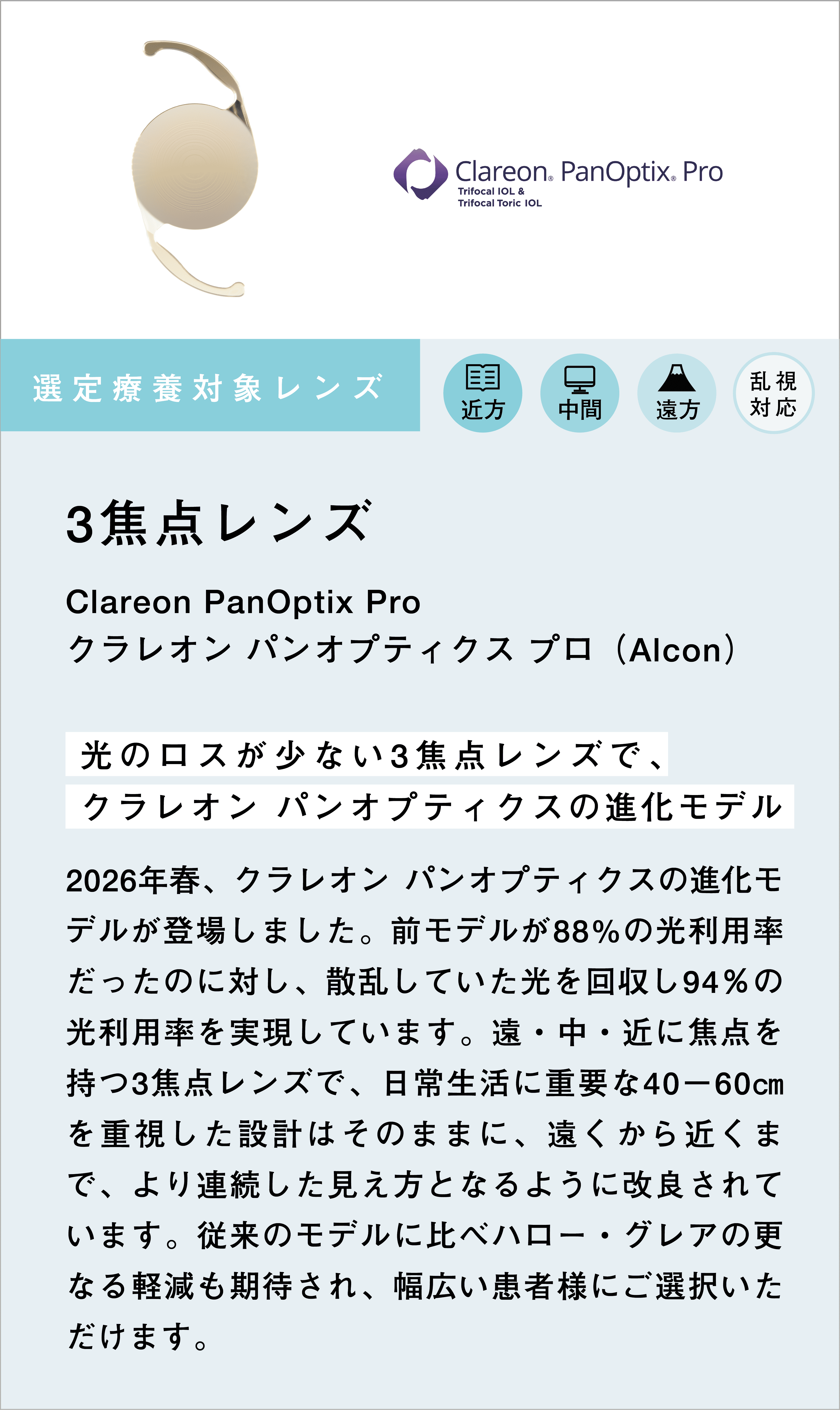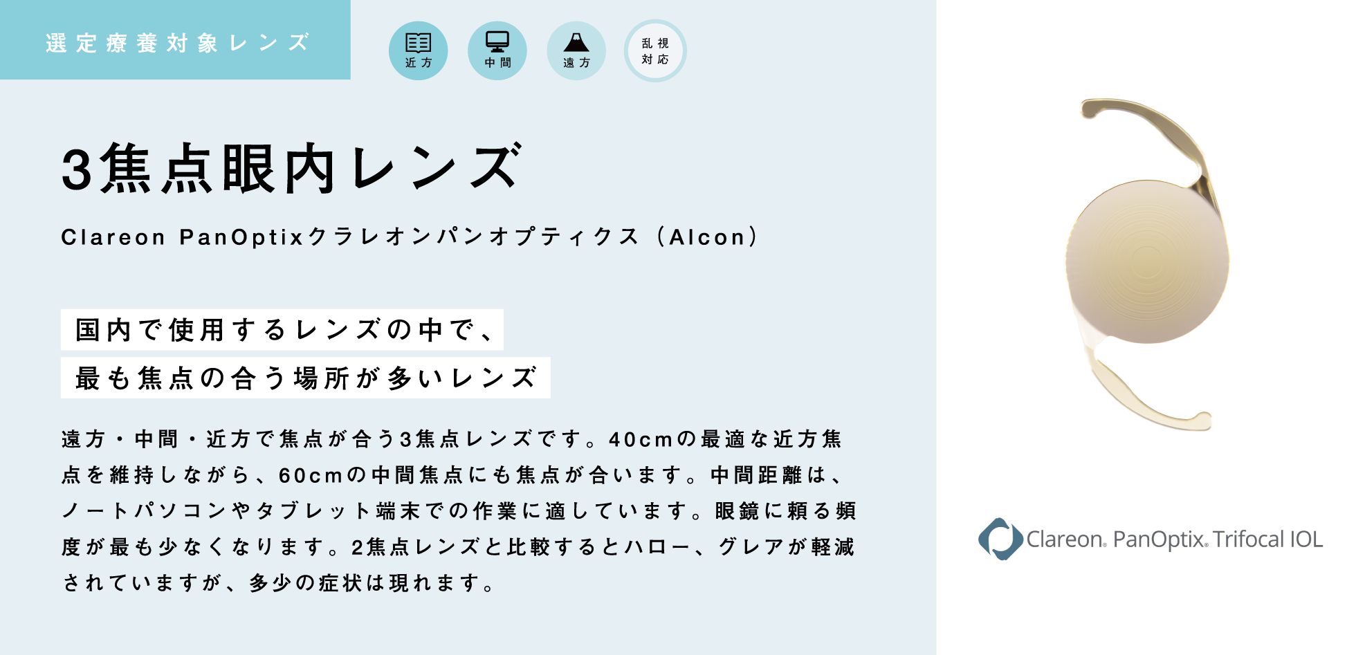 多焦点レンズも選定療養のものを取り揃え、多くの症例を執刀しております。