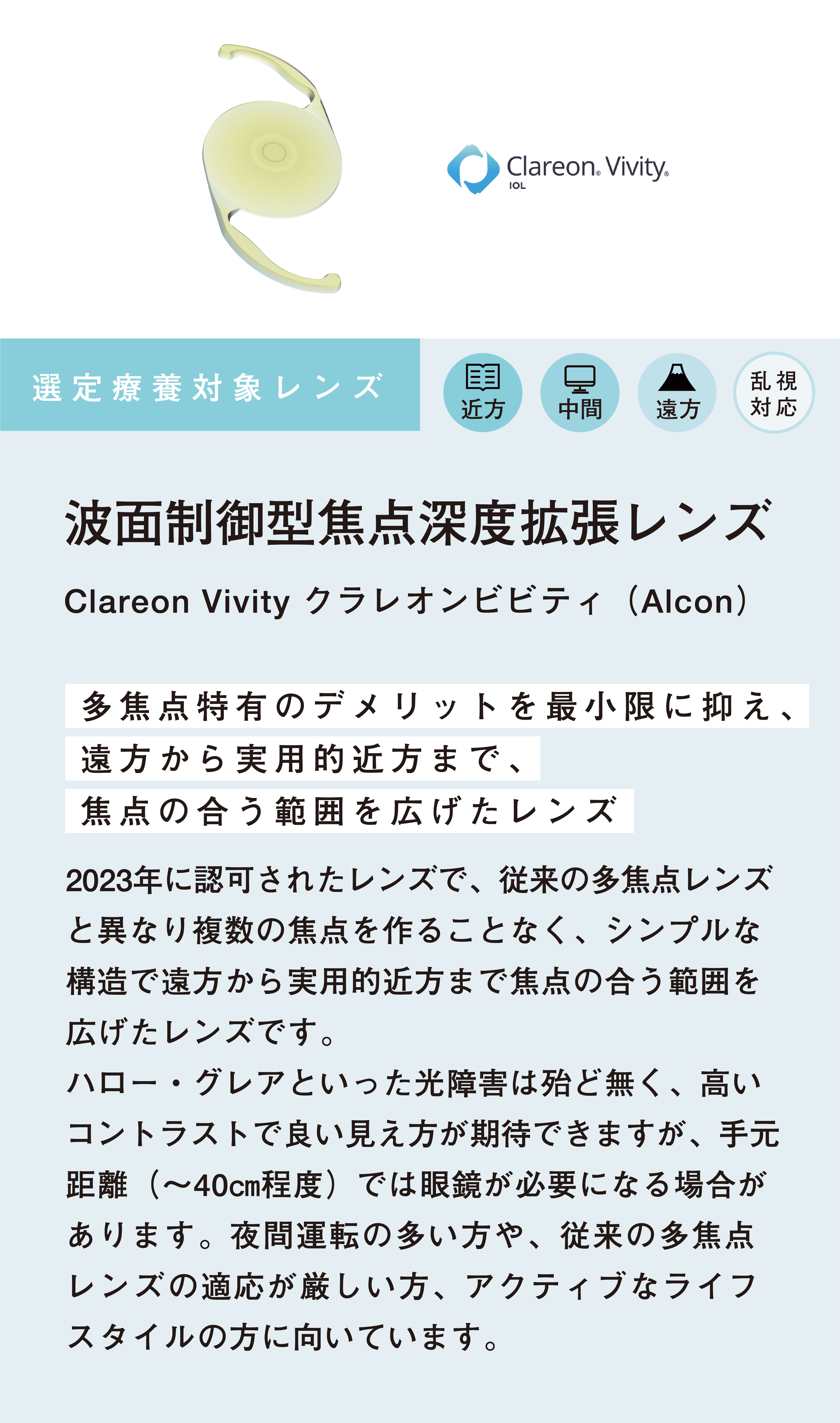- 令和2年4月より、多焦点眼内レンズを用いた白内障手術は、厚生労働省が定める選定療養の対象となりました。
